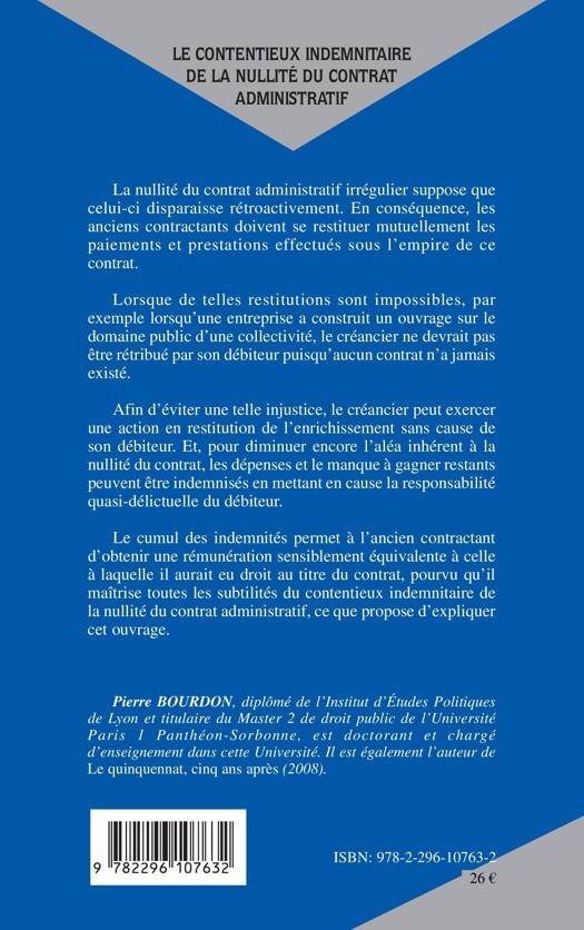 La nullité du contrat administratif irrégulier suppose sa disparition rétroactive. Les anciens contractants doivent se restituer les paiements et prestations effectués sous ce contrat. Lorsque ces restitutions sont impossibles, le créancier peut exercer une action en restitution de l'enrichissement sans cause de son débiteur. Les indemnités obtenues sont sensiblement équivalentes à la rémunération à laquelle l'ancien contractant aurait eu droit au titre du contrat, pourvu qu'il maîtrise toutes les subtilités du contentieux indemnitaire de la nullité du contrat administratif ici expliquées.