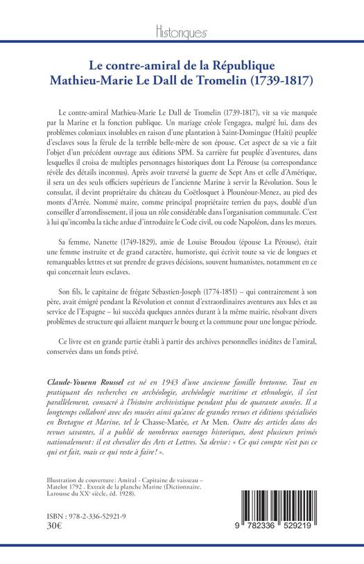 Le contre-amiral Mathieu-Marie Le Dall de Tromelin (1739-1817), vit sa vie marquée par la Marine et la fonction publique. Un mariage créole l'engagea, malgré lui, dans des problèmes coloniaux insolubles en raison d'une plantation à Saint-Domingue (Haïti) peuplée d'esclaves sous la férule de la terrible belle-mère de son épouse. Cet aspect de sa vie a fait l'objet d'un précédent ouvrage aux éditions SPM. Sa carrière fut peuplée d'aventures, dans lesquelles il croisa de multiples personnages historiques dont La Pérouse (sa correspondance révèle des détails inconnus). Après avoir traversé la guerre de Sept Ans et celle d'Amérique, il sera un des seuls officiers supérieurs de l'ancienne Marine à servir la Révolution. Sous le consulat, il devint propriétaire du château du Coëtlosquet à Plounéour-Menez, au pied des monts d'Arrée. Nommé maire, comme principal propriétaire terrien du pays, doublé d'un conseiller d'arrondissement, il joua un rôle considérable dans l'organisation communale. C'est à lui qu'incomba la tâche ardue d'introduire le Code civil, ou code Napoléon, dans les moeurs. Sa femme, Nanette (1749-1829), amie de Louise Broudou (épouse La Pérouse), était une femme instruite et de grand caractère, humoriste, qui écrivit toute sa vie de longues et remarquables lettres et sut prendre de graves décisions, souvent humanistes, notamment en ce qui concernait leurs esclaves. Son fils, le capitaine de frégate Sébastien-Joseph (1774-1851) - qui contrairement à son père, avait émigré pendant la Révolution et connut d'extraordinaires aventures aux Isles et au service de l'Espagne - lui succéda quelques années durant à la même mairie, résolvant divers problèmes de structure qui allaient marquer le bourg et la commune pour une longue période. Ce livre est en grande partie établi à partir des archives personnelles inédites de l'amiral, conservées dans un fonds privé.