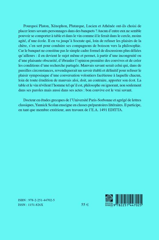 Pourquoi Platon, Xenophon, Plutarque, Lucien et Athenee ont-ils choisi de placer leurs savants personnages dans des banquets ? Aucun d'entre eux ne semble pouvoir se comporter a table et dans le vin comme il le ferait dans le cercle, moins agite, d'une ecole. Il en va jusqu'a Socrate qui, loin de refuser les plaisirs de la chere, s'en sert pour conduire ses compagnons de boisson vers la philosophie. Car le banquet ne constitue pas le simple cadre formel de discussions plus deliees qu'ailleurs: il en devient le sujet meme et permet, a partir d'une incongruite ou d'une plaisante obscurite, d'ebranler l'opinion premiere des convives et de creer les conditions d'une recherche partagee. Mauvais savant serait celui qui, dans de pareilles circonstances, revendiquerait un savoir etabli et definitif pour refuser le plaisir symposiaque d'une conversation volontiers facetieuse a laquelle chacun, loin de toute erudition de mauvais aloi, doit, au contraire, apporter son ecot. La table et le vin revelent l'homme tel qu'il est, philosophe ou ignorant, non seulement dans ses paroles mais aussi dans ses actes: bon convive est le vrai savant.
