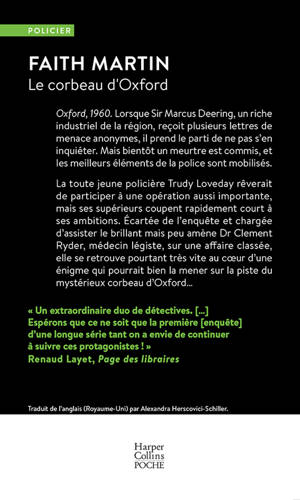 Oxford, 1960. Lorsque Sir Marcus Deering, un riche industriel de la région, reçoit plusieurs lettres de menace anonymes, il prend le parti de ne pas s’en inquiéter. Mais bientôt, un meurtre est commis, et les meilleurs éléments de la police d’Oxford sont mobilisés. La toute jeune policière Trudy Loveday rêverait de participer à une affaire aussi importante, mais ses supérieurs coupent rapidement court à ses ambitions. Écartée de l’enquête et chargée d’assister le brillant mais peu amène Dr Clement Ryder, médecin légiste, sur une affaire classée, elle se retrouve pourtant très vite au cœur d’une énigme qui pourrait bien la mener sur la piste du mystérieux corbeau d’Oxford… Traduit de l’anglais (Royaume-Uni) par Alexandra Herscovici-Schiller.
