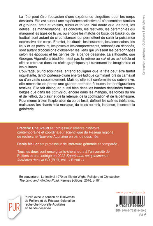 La fête peut être l’occasion d’une expérience singulière pour les corps dessinés. Elle est surtout une expérience collective où s’assemblent familles et groupes, amis et voisins, tribus et foules. Nul doute que les bals, les défilés, les manifestations, les concerts, les festivals, les cérémonies qui marquent les âges de la vie, ou encore les matchs de boxe, de basket ou de football sont autant de circonstances qui permettent de saisir la puissance expressive des corps. En effet, les rituels, les costumes, les accessoires, les lieux et les parcours, les poses et les comportements, ordonnés ou débridés, sont autant d’occasions d’observer les liens qui unissent les personnages selon les époques et les genres de la bande dessinée. La silhouette, que Georges Vigarello a étudiée, n’est pas la même au XIXe et au XXe siècle et elle se retrouve dans les récits graphiques qui traversent les imaginaires et les cultures.