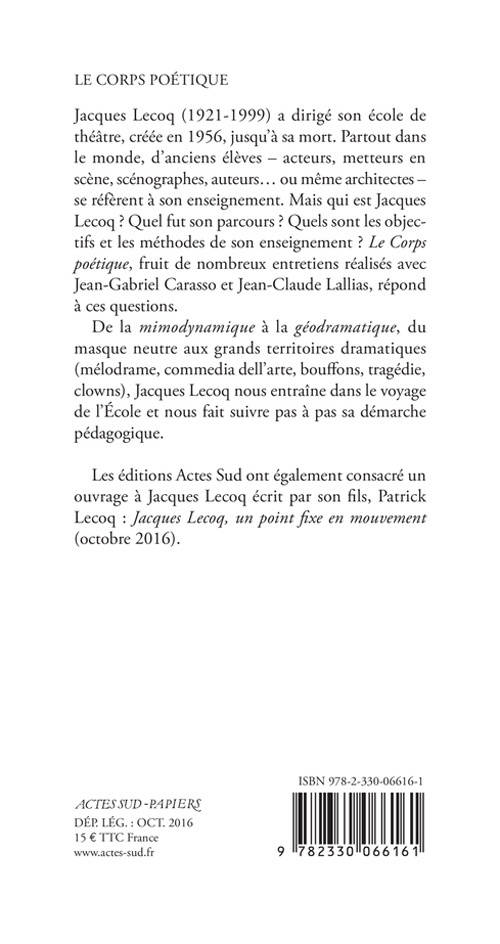 Jacques Lecoq (1921-1999) a dirigé son école de théâtre, créée en 1956, jusqu'à sa mort. Partout dans le monde, d'anciens élèves - acteurs, metteurs en scène, scénographes, auteurs... ou même architectes - se réfèrent à son enseignement. Mais qui est Jacques Lecoq ? Quel fut son parcours ? Quels sont les objectifs et les méthodes de son enseignement ? «Le Corps» «poétique», fruit de nombreux entretiens réalisés avec Jean-Gabriel Carasso et Jean-Claude Lallias, répond à ces questions. De la «mimodynamique» à la «géodramatique», du masque neutre aux grands territoires dramatiques (mélodrame, commedia dell'arte, bouffons, tragédie, clowns), Jacques Lecoq nous entraîne dans le voyage de l'École et nous fait suivre pas à pas sa démarche pédagogique.