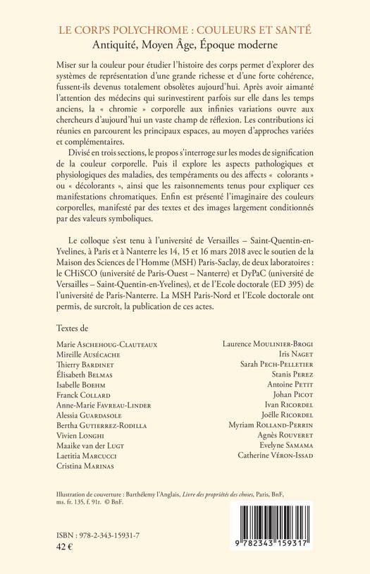 Après avoir aimanté l'attention des médecins qui surinvestirent parfois sur elle dans les temps anciens, la "chromie" corporelle aux infinies variations ouvre aux chercheurs d'aujourd'hui un vaste champ de réflexion. Les contributions ici réunies en parcourent les principaux espaces, au moyen d'approches variées et complémentaires. Divisé en trois sections, le propos s'interroge sur les modes de signification de la couleur corporelle. Puis il explore les aspects pathologiques et physiologiques des maladies, des tempéraments ou des affects "colorants" ou "décolorants", ainsi que les raisonnements tenus pour expliquer ces manifestations chromatiques. Enfin est présenté en fin d'ouvrage l'imaginaire des couleurs corporelles.