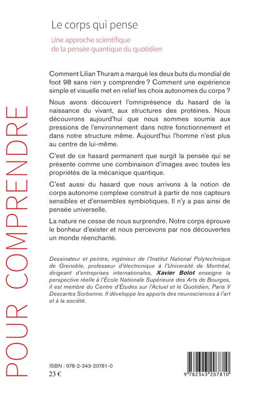 Comment Lilian Thuram a marqué les deux buts du mondial de foot 98 sans rien y comprendre ? Comment une expérience simple et visuelle met en relief les choix autonomes du corps ? Nous avons découvert l'omniprésence du hasard de la naissance du vivant, aux structures des protéines. Nous découvrons aujourd'hui que nous sommes soumis aux pressions de l'environnement dans notre fonctionnement et dans notre structure même. Aujourd'hui l'homme n'est plus au centre de lui-même.C'est de ce hasard permanent que surgit la pensée qui se présente comme une combinaison d'images avec toutes les propriétés de la mécanique quantique.