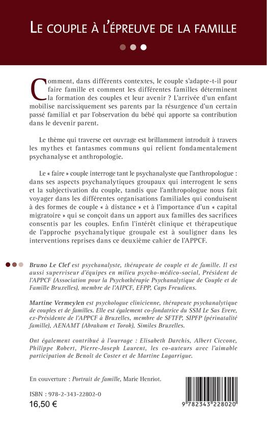 Comment, dans différents contextes, le couple s’adapte-t-il pour faire famille et comment les différentes familles déterminent la formation des couples et leur avenir ? L’arrivée d’un enfant mobilise narcissiquement ses parents par la résurgence d’un certain passé familial et par l’observation du bébé qui apporte sa contribution dans le devenir parent. Le thème qui traverse cet ouvrage est brillamment introduit à travers les mythes et fantasmes communs qui relient fondamentalement psychanalyse et anthropologie. Le « faire » couple interroge tant le psychanalyste que l’anthropologue : dans ses aspects psychanalytiques groupaux qui interrogent le sens et la subjectivation du couple, tandis que l’anthropologue nous fait voyager dans les différentes organisations familiales qui conduisent à des formes de couple « à distance » et à l’importance d’un « capital migratoire » qui se conçoit dans un apport aux familles des sacrifices consentis par les couples. Enfin l’intérêt clinique et thérapeutique de l’approche psychanalytique groupale est à souligner dans les interventions reprises dans ce deuxième cahier de l’APPCF.