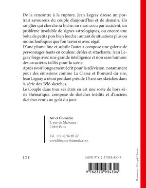De la rencontre à la rupture, Jean Legeay dresse un portrait savoureux du couple d'aujourd'hui et de demain. Un sanglier qui cherche sa biche, un mari cocu par accident, un problème insoluble de signes astrologiques, ou encore une boîte de petits pois bien louche : autant de situations plus ou moins loufoques que l'on traverse avec régal. D'une plume fine et subtile l'auteur compose une galerie de personnages hauts en couleur, drôles et attachants. Jean Legeay forge avec une grande intelligence et non sans humour des caractères taillés pour la scène. Après avoir longuement écrit pour la télévision, notamment pour des émissions comme La Classe et Bouvard du rire, Jean Legeay a réuni pendant près de 15 ans ses sketches dans la série des Télé-sketches. Le Couple dans tous ses états en est une sorte de hors-série thématique, composé de sketches inédits et d'anciens sketches remis au goût du jour.