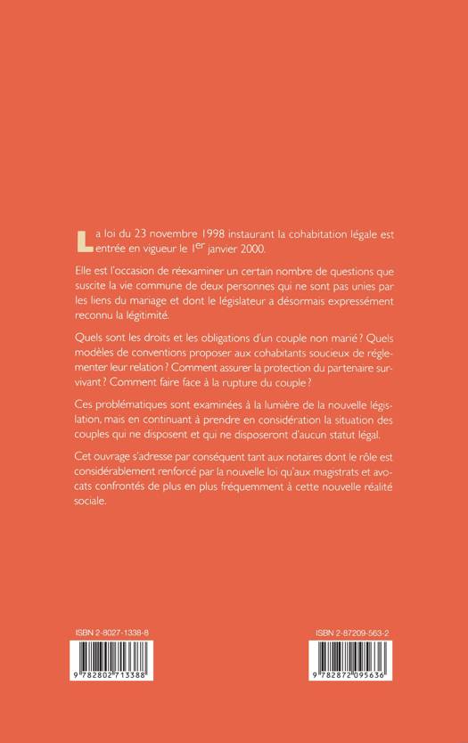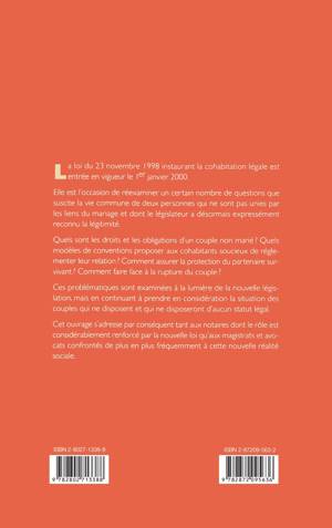 La loi du 23 novembre 1998 instaurant la cohabitation légale est entrée en vigueur le 1er janvier 2000. Elle est l'occasion de réexaminer un certain nombre de questions que suscite la vie commune de deux personnes qui ne sont pas unies par les liens du mariage et dont le législateur a désormais expressément reconnu la légitimité. Cet ouvrage s'adresse aux notaires dont le rôle est considérablement renforcé par la nouvelle loi ainsi qu'aux magistrats et avocats confrontés de plus en plus à cette nouvelle réalité sociale.