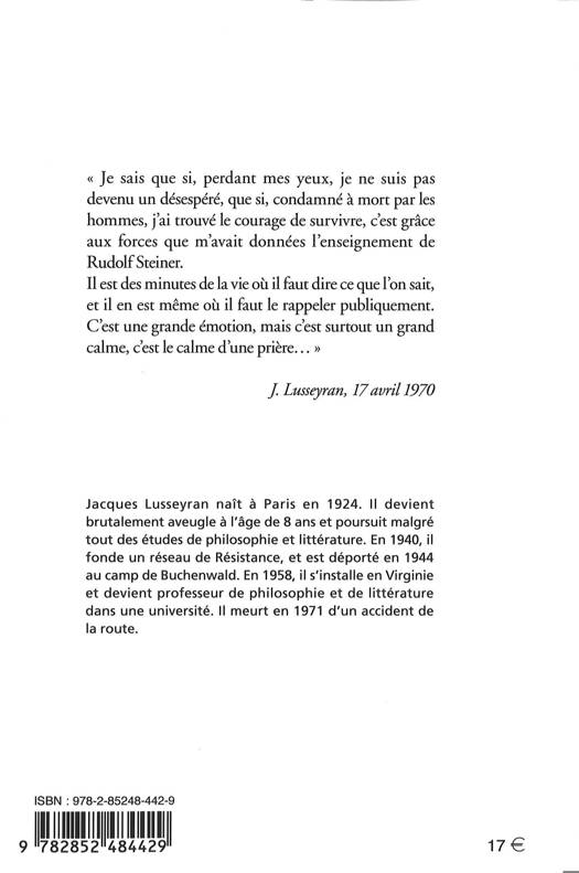 « Je sais que si, perdant mes yeux, je ne suis pas devenu un désespéré, que si, condamné à mort par les hommes, j’ai trouvé le courage de survivre, c’est grâce aux forces que m’avait données l’enseignement de Rudolf Steiner. Il est des minutes de la vie où il faut dire ce que l’on sait, et il en est même où il faut le rappeler publiquement. C’est une grande émotion, mais c’est surtout un grand calme, c’est le calme d’une prière… » J. Lusseyran, 17 avril 1970 Jacques Lusseyran naît à Paris en 1924. Il devient brutalement aveugle à l’âge de 8 ans et poursuit malgré tout des études de philosophie et littérature. En 1940, il fonde un réseau de résistance, et est déporté en 1944 au camp de Buchenwald. En 1958, il s’installe en Virginie et devient professeur de philosophie et de littérature dans une université. Il meurt en 1971 d’un accident de la route.
