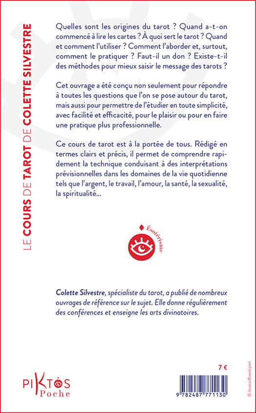 Quelles sont les origines du tarot ? Quand a-t-on commencé à lire les cartes ? À quoi sert le tarot ? Quand et comment l'utiliser ? Comment l'aborder et, surtout, comment le pratiquer ? Faut-il un don ? Existe-t-il des méthodes pour mieux saisir le message des tarots ? Cet ouvrage a été conçu non seulement pour répondre à toutes les questions que l'on se pose autour du tarot, mais aussi pour permettre de l'étudier en toute simplicité, avec facilité et efficacité, pour le plaisir ou pour en faire une pratique plus professionnelle. Ce cours de tarot est à la portée de tous. Rédigé en termes clairs et précis, il permet de comprendre rapidement la technique conduisant à des interprétations prévisionnelles dans les domaines de la vie quotidienne tels que l'argent, le travail, l'amour, la santé, la sexualité, la spiritualité…