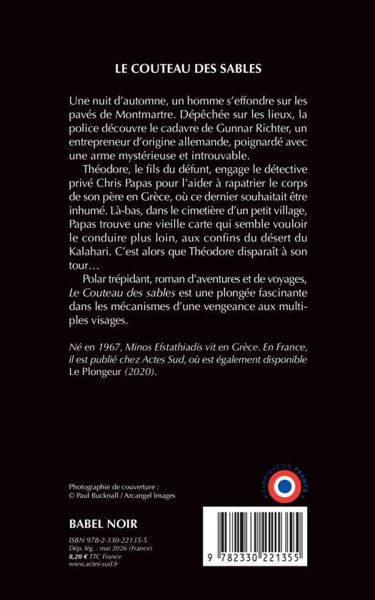 Une nuit d'automne, un homme s'effondre sur les pavés de Montmartre. Dépêchée sur les lieux, la police découvre le cadavre de Gunnar Richter, un entrepreneur d'origine allemande, poignardé avec une arme mystérieuse et introuvable. Théodore, le fils du défunt, engage le détective privé Chris Papas pour l'aider à rapatrier le corps de son père en Grèce, où ce dernier souhaitait être inhumé. Là-bas, dans le cimetière d'un petit village, Papas trouve une vieille carte qui semble vouloir le conduire plus loin, aux confins du désert du Kalahari. C'est alors que Théodore disparaît à son tour... Polar trépidant, roman d'aventures et de voyages, Le Couteau des sables est une plongée fascinante dans les mécanismes d'une vengeance aux multiples visages.
