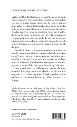 La pluie s'infiltre dans la maison, l'intervention d'un couvreur est nécessaire. Un professionnel se présente avec ponctualité. Dès ses premières heures passées sur le toit, cet artisan intrigue la propriétaire des lieux : le silence de ses pas sur les tuiles est surprenant, l'homme est d'une absolue discrétion. Touchée par cette forme de courtoisie préservant le calme des lieux, la dame lui propose un thé et la conversation s'engage poliment. L'artisan parle de son métier, de son attachement à ce monde d'en haut, qu'il s'agisse des toits de simples habitations ou de ceux des grands temples bouddhiques. D'un thé à l'autre, il évoque non seulement le Japon et ses toits majestueux mais aussi ceux des cathédrales gothiques européennes. Fascinée, la dame pose des questions. Avec humilité le couvreur évoque alors une manière particulière, active de rêver qui, à force d'entraînement, permet d'atteindre pendant le sommeil des lieux aussi lointains qu'attirants. D'une grande douceur, délibérément poétique dans son intention initiatique, ce roman aborde avec virtuosité la magie des rêves choisis, des rêves à épisodes, où chacun peut rejoindre un monde qui lui est cher. Vivre une autre vie. Voyager.