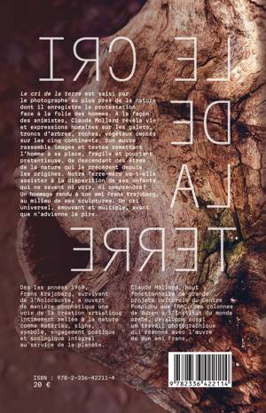 Le cri de la terre est saisi par le photographe au plus près de la nature dont il enregistre la protestation face à la folie des hommes. À la façon des animistes, Claude Mollard révèle vie et expressions humaines sur les galets, troncs d'arbres, roches, végétaux captés sur les cinq continents. Son oeuvre rassemble images et textes remettant l'homme à sa place, fragile et pourtant prétentieuse, de descendant des êtres de la nature qui le précédent depuis les origines. Notre Terre-mère va-t-elle assister à la disparition de ses enfants qui ne savent ni voir, ni comprendre ?
