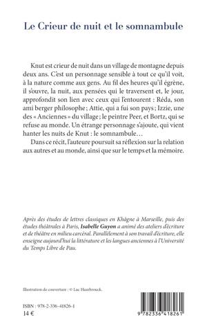 Knut est crieur de nuit dans un village de montagne depuis deux ans. C’est un personnage sensible à tout ce qu’il voit, à la nature comme aux gens. Au fil des heures qu’il égrène, il s’ouvre, la nuit, aux pensées qui le traversent et, le jour, approfondit son lien avec ceux qui l’entourent : Réda, son ami berger philosophe ; Attie, qui a fui son pays ; Izzie, une des « Anciennes » du village ; le peintre Peer, et Bortz, qui se refuse au monde. Un étrange personnage s’ajoute, qui vient hanter les nuits de Knut : le somnambule… Dans ce récit, l’auteure poursuit sa réflexion sur la relation aux autres et au monde, ainsi que sur le temps et la mémoire.