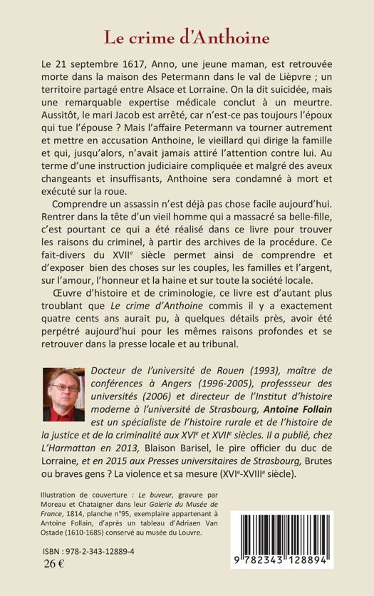 Le 21 septembre 1617, une jeune maman est retrouvée morte dans la maison des Petermann dans le val de Lièpvre, entre Alsace et Lorraine. On la dit suicidée, mais l'expertise médicale conclut au meurtre. L'affaire Petermann va accuser Anthoine, le vieillard qui dirige la famille et qui n'avait jamais attiré l'attention. Au terme de l'instruction juridique, Anthoine sera condamné à mort. Le crime d'Anthoine commis il y a 400 ans aurait pu avoir été perpétré aujourd'hui pour les mêmes raisons profondes et se retrouver dans la presse et au tribunal.