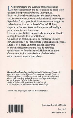L'auteur imagine une aventure passionnelle entre Sherlock Holmes et une de ses clientes de Baker Street qui le sollicite pour résoudre une affaire privée. Il faut savoir que l'on ne reconnaît à ce grand détective aucune aventure amoureuse, conformément à sa misogynie légendaire. Pour la première fois cette rencontre imaginaire va bouleverser tous les repères de Sherlock Holmes, au point de l'amener à concevoir un plan machiavélique pour commettre un crime atroce. C'est un legs de Watson transmis à l'auteur qui va dévoiler ce chapitre occulte de la vie d'Holmes. Ce livre est un pastiche pénétré de l'ambiance littéraire de Conan Doyle et de l'atmosphère londonienne de l'époque. Drôle, il est d'abord un roman policier à suspense et entraîne le lecteur dans une série de péripéties qui séduiront les fans de Sherlock Holmes et les initiés. Cet ouvrage, fiction inversée du mythe holmesien est un roman exaltant et iconoclaste.