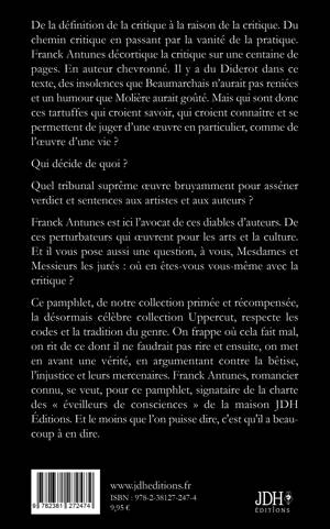 De la définition de la critique à la raison de la critique. Du chemin critique en passant par la vanité de la pratique. Franck Antunes décortique la critique sur une centaine de pages. En auteur chevronné. Il y a du Diderot dans ce texte, des insolences que Beaumarchais n'aurait pas reniées et un humour que Molière aurait goûté. Mais qui sont donc ces tartuffes qui croient savoir, qui croient connaître et se permettent de juger d'une oeuvre en particulier, comme de l'oeuvre d'une vie ? Qui décide de quoi ? Quel tribunal suprême oeuvre bruyamment pour asséner verdict et sentences aux artistes et aux auteurs ? Franck Antunes est ici l'avocat de ces diables d'auteurs. De ces perturbateurs qui oeuvrent pour les arts et la culture. Et il vous pose aussi une question, à vous, Mesdames et Messieurs les jurés : où en êtes-vous vous-même avec la critique ? Ce pamphlet, de notre collection primée et récompensée, la désormais célèbre collection Uppercut, respecte les codes et la tradition du genre. On frappe où cela fait mal, on rit de ce dont il ne faudrait pas rire et ensuite, on met en avant une vérité, en argumentant contre la bêtise, l'injustice et leurs mercenaires. Franck Antunes, romancier connu, se veut, pour ce pamphlet, signataire de la charte des « éveilleurs de consciences » de la maison JDH Éditions. Et le moins que l'on puisse dire, c'est qu'il a beaucoup à en dire.