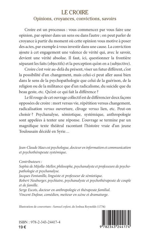 Croire est un processus : vous commencez par vous faire une opinion, par opiner dans un sens ou dans l’autre ; on peut parler de croyance à partir du moment où cette opinion vous motive à poser des actes, par exemple à vous investir dans une cause. La conviction ajoute à cet engagement une valence de vérité qui, avec le savoir, devient une vérité absolue. Il faut, ici, questionner la frontière séparant les faits (objectifs) et la perception qu’on en a (subjective). Croire c’est voir au-delà du présent, viser un futur différent, c’est la possibilité d’un changement, mais celui-ci peut aller aussi bien dans le sens de la psychopathologie que celui de la guérison, de la religion ou de la militance que d’un radicalisme, du suicide que du beau geste, etc. Qu’est-ce qui fait la différence ? Le fil rouge de cet ouvrage collectif est de différencier deux façons opposées de croire : mort versus vie, répétition versus changement, radicalisation versus ouverture, clivage versus lien, etc. Peut-on choisir ? Psychanalyse, sémiotique, systémique, anthropologie sont appelées à tenter une réponse. L’ouvrage se termine par un magnifique texte théâtral racontant l’histoire vraie d’un jeune Toulousain décédé en Syrie..