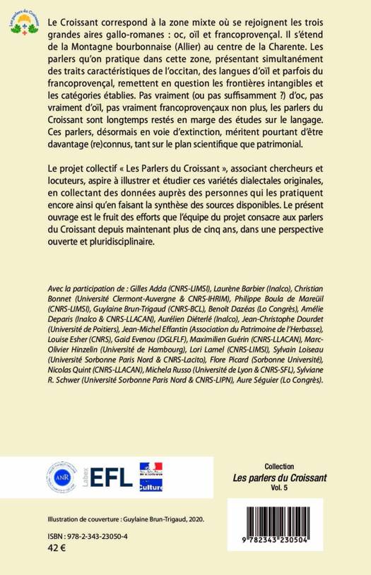 Le Croissant correspond à la zone mixte où se rejoignent les trois grandes aires gallo-romanes : oc, oïl et francoprovençal. Il s’étend de la Montagne bourbonnaise (Allier) au centre de la Charente. Les parlers qu’on pratique dans cette zone, présentant simultanément des traits caractéristiques de l’occitan, des langues d’oïl et parfois du francoprovençal, remettent en question les frontières intangibles et les catégories établies. Pas vraiment (ou pas suffisamment ?) d’oc, pas vraiment d’oïl, pas vraiment francoprovençaux non plus, les parlers du Croissant sont longtemps restés en marge des études sur le langage. Ces parlers, désormais en voie d’extinction, méritent pourtant d’être davantage (re)connus, tant sur le plan scientifique que patrimonial. Le projet collectif « Les Parlers du Croissant », associant chercheurs et locuteurs, aspire à illustrer et étudier ces variétés dialectales originales, en collectant des données auprès des personnes qui les pratiquent encore ainsi qu’en faisant la synthèse des sources disponibles. Le présent ouvrage est le fruit des efforts que l’équipe du projet consacre aux parlers du Croissant depuis maintenant plus de cinq ans, dans une perspective ouverte et pluridisciplinaire.