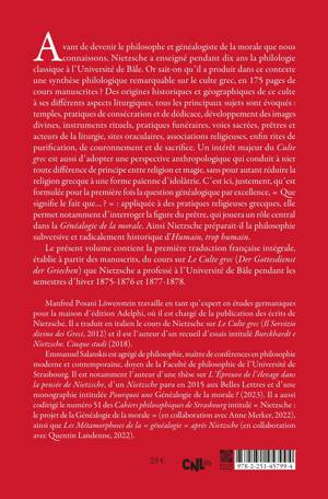 Avant de devenir le philosophe et généalogiste de la morale que nous connaissons, Nietzsche a enseigné pendant dix ans la philologie classique à l’Université de Bâle. Or sait-on qu’il a produit dans ce contexte une synthèse philologique remarquable sur le culte grec, en 175 pages de cours manuscrites ? Des origines historiques et géographiques de ce culte à ses différents aspects liturgiques, tous les principaux sujets sont évoqués : temples, pratiques de consécration et de dédicace, développement des images divines, instruments rituels, pratiques funéraires, voies sacrées, prêtres et acteurs de la liturgie, sites oraculaires, associations religieuses, enfin rites de purification, de couronnement et de sacrifice. Un intérêt majeur du Culte grec est aussi d’adopter une perspective anthropologique qui conduit à nier toute différence de principe entre religion et magie, sans pour autant réduire la religion grecque à une forme païenne d’idolâtrie. C’est ici, justement, qu’est formulée pour la première fois la question généalogique par excellence, « Que signifie le fait que… ? » : appliquée à des pratiques religieuses grecques, elle permet notamment d’interroger la figure du prêtre, qui jouera un rôle central dans la Généalogie de la morale. Ainsi Nietzsche préparait-il la philosophie subversive et radicalement historique d’Humain, trop humain.