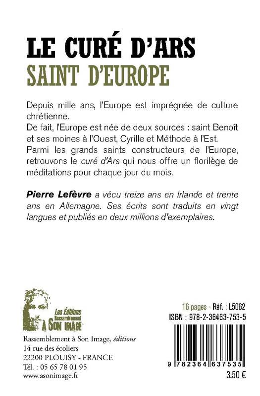 Curé d'Ars Saint d'Europe Depuis mille ans, l'Europe est imprégnée de culture chrétienne. De fait, l'Europe est née de deux sources : saint Benoît et ses moines à l'Ouest, Cyrille et Méthode à l'Est. Parmi les grands saints constructeurs de l'Europe, retrouvons le curé d'Ars qui nous offre un florilège de méditations pour chaque jour du mois.