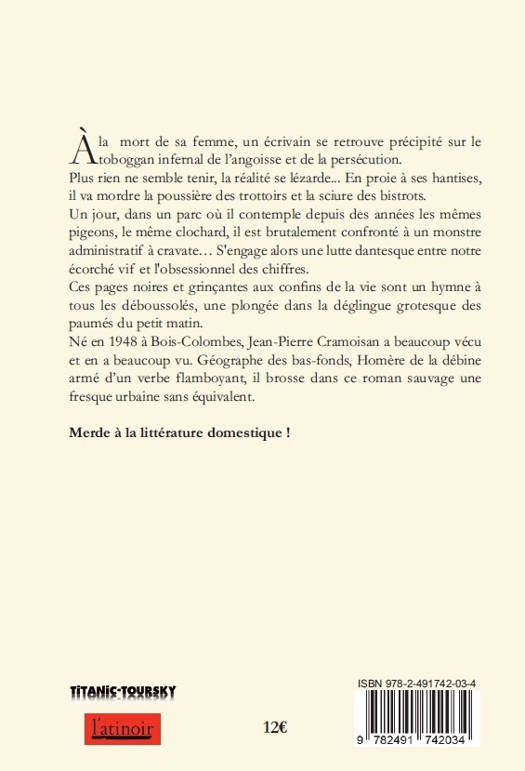 À la mort de sa femme, un écrivain se retrouve précipité dans une descente sans frein à travers l'enfer de l'angoisse et de la persécution. Un jour, dans un parc où il contemple depuis des années les mêmes pigeons, il est brutalement confronté à un monstre administratif à cravate... S'engage alors une lutte dantesque entre notre écorché vif et l'obsessionnel des chiffres. Ces pages noires et grinçantes sont un hymne à tous les déboussolés, un tableau du sida et de son jeu de massacre, une plongée dans la déglingue des paumés. Homère de la débine, Jean-Pierre Cramoisan descend dans les bas-fonds de l'esprit et brosse une fresque urbaine sauvage sans équivalent. Merde à la littérature ronronnante !