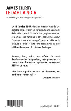 Le 15 janvier 1947, dans un terrain vague de Los Angeles, est découvert un corps sectionné au niveau de la taille : celui d'Elizabeth Short, aspirante actrice, surnommée "Le Dahlia noir" par le "Los Angeles Herald Examiner", à cause de son goût pour les vêtements noirs. Le meurtre est resté l'un des énigmes les plus célèbres des annales du crime en Amérique. Romans, films, récits, cette affaire n'a cessé d'enflammer les imaginations, mais personne n'a raconté cette histoire avec la puissance romanesque d'Ellroy. Un must. "Un livre superbe, un bloc de littérature, un bonheur de roman noir." Le Figaro littéraire