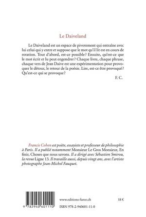 Le Daiveland est un espace de pivotement qui entraîne avec lui celui qui y entre et suppose que le mot qu’il lit est en cours de rotation. Tout d’abord, est-ce possible ? Ensuite, qu’est-ce que le mot écrit et lu peut engendrer ? Chaque livre, chaque phrase, chaque vers de Jean Daive est une expérimentation pour provoquer le détour, le retour de la poésie. Lire, est-ce être provoqué ? Qu’est-ce qui se provoque ?