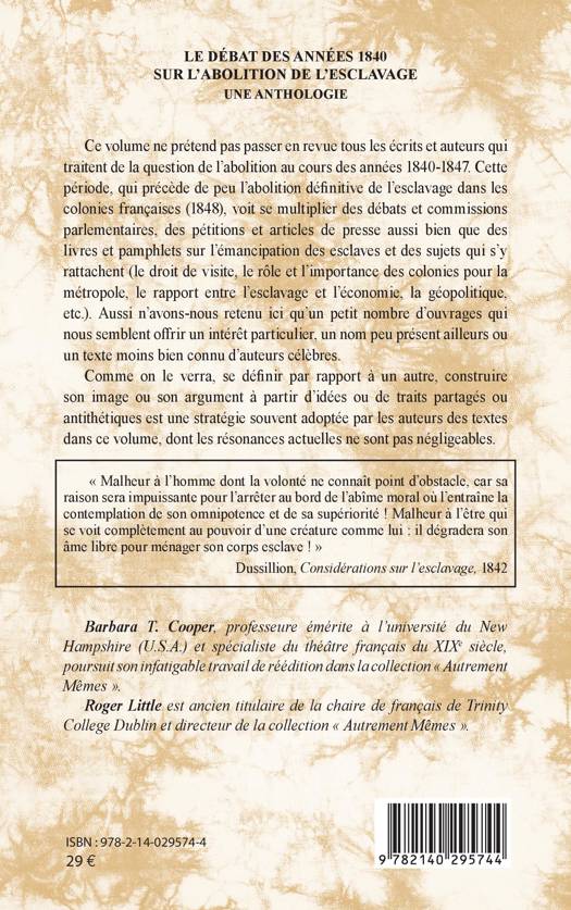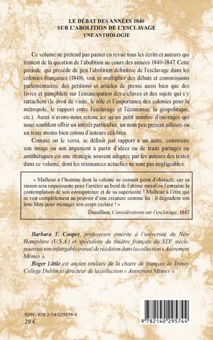 La période 1840-1847, qui précède de peu l'abolition définitive de l'esclavage dans les colonies françaises (1848), voit se multiplier des débats et commissions parlementaires, des pétitions et articles de presse aussi bien que des livres et pamphlets sur l'émancipation des esclaves et des sujets qui s'y rattachent (le droit de visite, le rôle et l'importance des colonies pour la métropole, le rapport entre l'esclavage et l'économie, la géopolitique, etc.). Se définir par rapport à un autre, construire son image ou son argument à partir d'idées ou de traits partagés ou antithétiques est une stratégie souvent adoptée par les auteurs des textes choisis dans ce volume, dont les résonances actuelles ne sont pas négligeables.