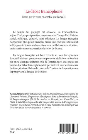 Le temps des préjugés est obsolète. La Francophonie, aujourd'hui, ne peut plus être perçue comme l'image d'un élitisme social, politique, culturel, voire ethnique. La langue française n'appartient plus qu'aux Français, mais à tous ceux qui l'utilisent et se l'approprient, non seulement comme outil de communication, mais aussi comme expression de soi et de l'Autre. La langue française est bien vivante et tous les systèmes éducatifs doivent prendre en compte cette réalité en se fondant sur une didactique du futur, celle de l'interculturel sous toutes ses formes. Ce débat francophone doit permettre à tous les locuteurs du français de se libérer du carcan de l'insécurité linguistique en s'appropriant la langue de Molière.