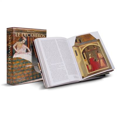 Une fresque fascinante de plus de cinq cents ouvres d'art en couleurs vient éclairer cette émouvante comédie humaine et amoureuse : les illustrations ornant les premières éditions de l'ouvrage, les dessins -tout récemment authentifiés- à la plume et à l'aquarelle de Boccace lui-même, les magnifiques miniatures du Manuscrit du Maître de la Cité des Dames, conservé au Vatican, et du Manuscrit Ceffini, conservé à la Bibliothèque nationale de France, les scènes somptueuses réalisées sur des coffres de mariages et des plateaux d'accouchée.