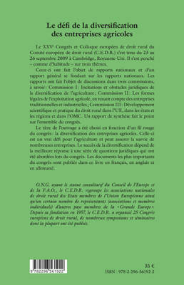 La diversification des entreprises agricoles est un vrai défi pour l'agriculture et peut assurer la survie de nombreuses entreprises. Sont abordés ici les thèmes suivants : les incitations et les obstacles juridiques de la diversification de l'agriculture ; le formes légales de l'exploitation agricole ; le développement scientifique et pratique du droit rural dans l'UE, les états et les régions, et dans l'OMC.