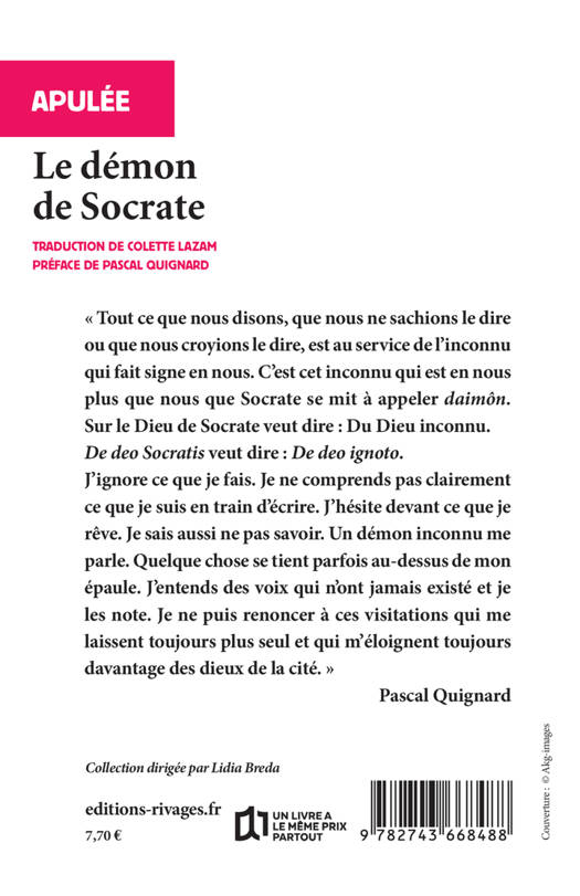 Dans ce traité bref et fascinant, Apulée explore la notion de « démon » telle que la concevait Socrate : une voix intérieure, messagère divine, intuition profonde ou génie spirituel. Complété par une préface sensible de Pascal Quignard, ce texte ancien mêle philosophie, religion, ésotérisme et mystère. Un petit livre atypique, spirituel et intemporel, idéal pour les lecteurs curieux de sagesse antique et de mystique discrète. Déjà 4 800 ex. vendus avant épuisement.