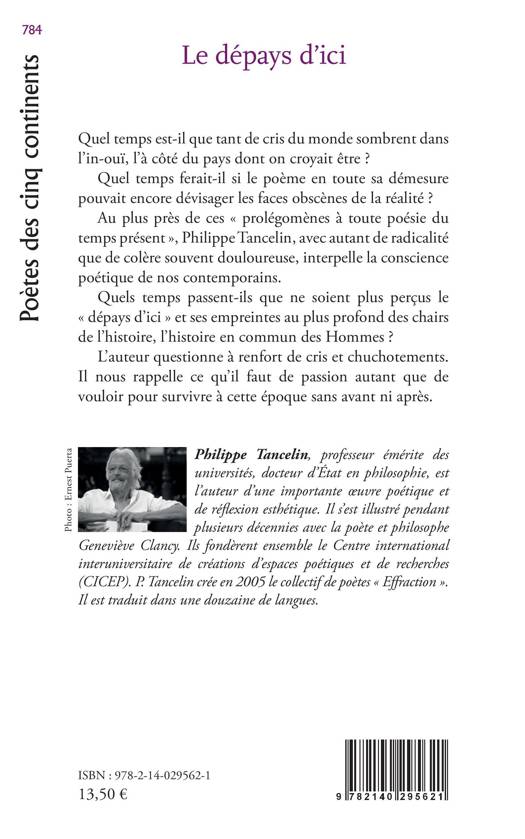 Quel temps est-il que tant de cris du monde sombrent dans l'in-ouï, l'à côté du pays dont on croyait être ? Quel temps ferait-il si le poème en toute sa démesure pouvait encore dévisager les faces obscènes de la réalité ? Au plus près de ces « prolégomènes à toute poésie du temps présent », Philippe Tancelin, avec autant de radicalité que de colère souvent douloureuse, interpelle la conscience poétique de nos contemporains. Quels temps passent-ils que ne soient plus perçus le « dépays d'ici » et ses empreintes au plus profond des chairs de l'histoire, l'histoire en commun des Hommes ? L'auteur questionne à renfort de cris et chuchotements. Il nous rappelle ce qu'il faut de passion autant que de vouloir pour survivre à cette époque sans avant ni après.