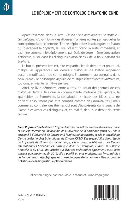 Le but de cet ouvrage est de démontrer pourquoi, malgré les apparences, les derniers dialogues de Platon n'opèrent aucune modification de son ontologie. Et comment, au contraire, dans ceux-ci, le philosophe déploie la même pensée. Ainsi, ce livre démontre, entre autres, pourquoi des thèmes de ces dialogues tardifs, tels que la « communauté mutuelle des genres », le « parricide » de Parménide, la constitution « mixte » des Idées, etc., ne doivent absolument pas être compris comme des nouveautés ; mais comme des thèmes qui sont déjà présents dans l'uvre de Platon bien avant ces dialogues, et, en réalité, depuis le début de cette uvre.