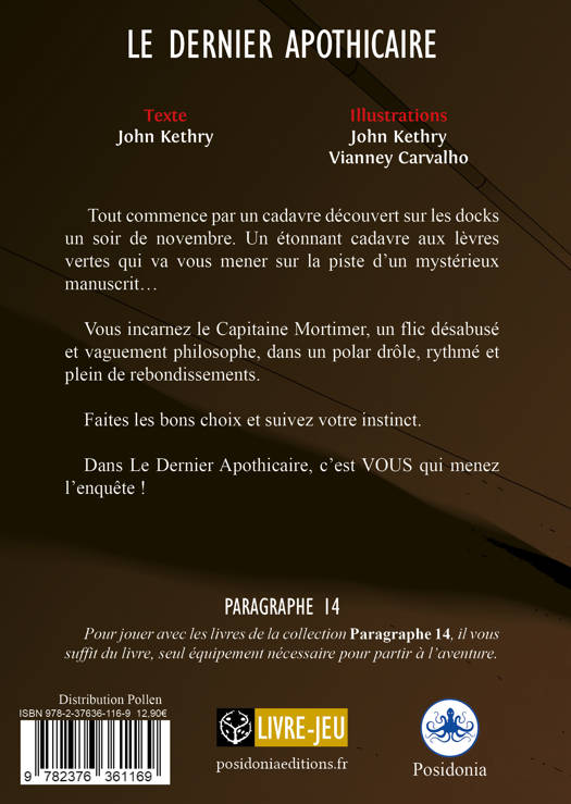 Tout commence par un cadavre découvert sur les docks un soir de novembre. Un étonnant cadavre aux lèvres vertes qui va vous mener sur la piste d’un mystérieux manuscrit...<br /><br /> Vous incarnez le Capitaine Mortimer, un flic désabusé et vaguement philosophe, dans un polar drôle, rythmé et plein de rebondissements.<br /><br /> Faites les bons choix et suivez votre instinct.<br /><br /> Dans Le Dernier Apothicaire, c’est VOUS qui menez l’enquête !