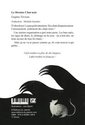 Le Dernier Chat noir, publié en Grèce en 2001, a été immédiatement traduit en anglais puis en de nombreuses autres langues (chinois, italien, espagnol, russe, hébreu, turc, norvégien, etc.). Sous la forme d’une fable animale, ce roman aborde par le biais de l’humour et de la satire le sujet du racisme, éraflant aussi au passage le monde politique, son opportunisme et sa corruption. Les chats noirs, ça porte malheur, dit-on. Ils sont les boucs émissaires et la source de tous les maux : fientes de pigeon, rage de dents, chômage ou crise. À la veille des élections, les ministres l’ont vite compris : ils vont prêter main-forte à une sinistre organisation qui ne jure que par l’anéantissement complet de l’espèce. Mais sur leur route va se dresser un chat noir, bien sûr, un chat des rues, combatif et qui n’a pas sa langue dans sa poche. Le récit, plein de suspense et d’action, nous embarque dans un monde qui rappelle l’univers de Jacques Prévert, Roald Dahl ou Georges Orwell. Un texte drôle et inventif, porteur de valeurs humaines, qui captive petits et grands.