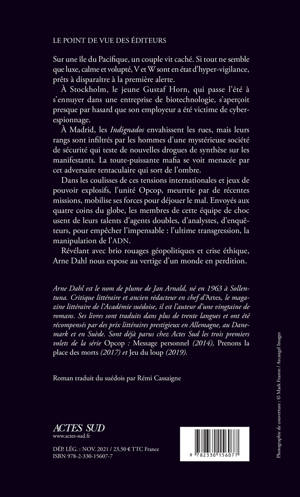 Sur une île du Pacifique, un couple vit caché. Si tout ne semble que luxe, calme et volupté, V et W sont en état d'hyper- vigilance, prêts à disparaître à la première alerte. À Stockholm, le jeune Gustaf Horn, qui passe l'été à s'ennuyer dans une entreprise de biotechnologie, s'aperçoit presque par hasard que son employeur a été victime de cyber-espionnage. À Madrid, les Indignados envahissent les rues, mais leurs rangs sont infiltrés par les hommes d'une mystérieuse société de sécurité qui teste de nouvelles drogues de synthèse sur les manifestants. La toute-puissante mafia se voit menacée par cet adversaire tentaculaire qui sort de l'ombre. Dans les coulisses de ces tensions internationales et jeux de pouvoir explosifs, l'unité Opcop, meurtrie par de récentes missions, mobilise ses forces pour déjouer le mal. Envoyés aux quatre coins du globe, les membres de cette équipe de choc usent de leurs talents d'agents doubles, d'analystes, d'enquêteurs, pour empêcher l'impensable : l'ultime transgression, la manipulation de l'ADN. Révélant avec brio rouages géopolitiques et crise éthique, Arne Dahl nous expose au vertige d'un monde en perdition.