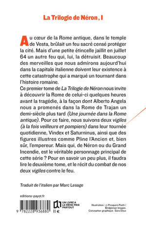 Ce premier tome de La Trilogie de Néron nous invite à découvrir la Rome de celui-ci quelques heures avant la tragédie, à la façon dont Alberto Angela nous a promenés dans la Rome de Trajan un demi-siècle plus tard. (Une journée dans la Rome antique). Pour ce faire, nous suivons deux vigiles (à la fois veilleurs et pompiers) dans leur tournée quotidienne, Vindex et Saturninus, ainsi que des figures illustres comme Pline l'Ancien et, bien sûr, l'empereur. Mais qui, de Néron ou du Grand Incendie, est le véritable personnage principal de cette série ? Pour en savoir un peu plus, il faudra lire le deuxième tome, et le récit du combat de nos deux vigiles contre le feu.