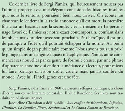 Ce dernier livre de Sergi Pàmies, qui heureusement ne sera pas l'ultime, propose avec une élégante concision des histoires insolites qui, nous le sentons, pourraient bien nous arriver. On écoute un chanteur, le lendemain la radio annonce qu'il est mort, la première fois c'est un hasard, mais la seconde... et la troisième ? Le personnage favori de Pàmies est notre exact contemporain, confiant dans les objets mais prudent avec son prochain. Peu héroïque, il est pris de panique à l'idée qu'il pourrait échapper à la norme. Au point qu'un simple slogan publicitaire comme "Nous avons tous un prix" le plonge dans une angoisse quasi métaphysique. Pàmies aime commencer ses nouvelles par ce genre de formule creuse, par une phrase d'apparence anodine qui endort la méfiance du lecteur, pour mieux lui faire partager sa vision drôle, cruelle mais jamais sombre du monde. Avec lui, l'intelligence est une fête.