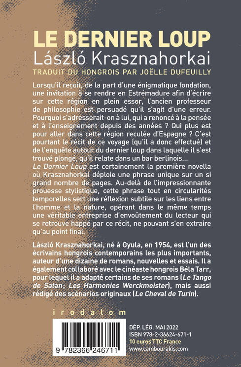 Lorsqu'il reçoit, de la part d'une énigmatique fondation, une invitation à se rendre en Estrémadure afin d'écrire sur cette région en plein essor, l'ancien professeur de philosophie est persuadé qu'il s'agit d'une erreur. Pourquoi s'adresserait-on à lui, qui a renoncé à la pensée et à l'enseignement depuis des années ? Qui plus est pour aller dans cette région reculée d'Espagne ? C'est pourtant le récit de ce voyage (qu'il a donc effectué) et de l'enquête autour du dernier loup dans laquelle il s'est trouvé plongé, qu'il relate dans un bar berlinois... Le Dernier Loup est certainement la première novella où Krasznahorkai déploie une phrase unique sur un si grand nombre de pages. Au-delà de l'impressionnante prouesse stylistique, cette phrase tout en circularités temporelles sert une réflexion subtile sur les liens entre l'homme et la nature, opérant dans le même temps une véritable entreprise d'envoûtement du lecteur qui se retrouve happé par ce récit, ne pouvant s'en extraire qu'au point final.