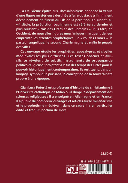 La Deuxieme epitre aux Thessaloniciens annonce la venue d'une figure mysterieuse destinee a faire obstacle a l'imminent dechainement de fureur du Fils de la perdition. En Orient, au VIIe siecle, la prediction paulinienne est referee au dernier et plus puissant rois des Grecs et des Romains . Plus tard, en Occident, de nouvelles figures messianiques marquent de leur empreinte les attentes prophetiques: le roi des Francs , le pasteur angelique, le second Charlemagne et enfin le peuple des villes. Cet ouvrage etudie les propheties, apocalypses et sibylles medievales les plus diffusees. Ces textes obscurs et allusifs se revelent de subtils instruments de propagande politico-religieuse: projetant a la fin des temps des luttes pour le pouvoir historiquement contemporaines, ils restituent, dans un langage symbolique puissant, la conception de la souverainete propre a une epoque.