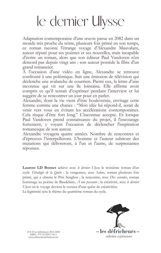 Laurent LD Bonnet estnavigateur-voyageur, romancier et nouvelliste. Il publie dès 1998 des nouvelles puis un premier roman remarqué, en 2012, Salone (Prix Senghor). Il poursuit avec Dix secondes (2015) et le dernier Ulysse (2021), formant ainsi les trois premières oeuvres d'une Tétralogie de la quête. La revue Daïmon consacre un numéro (Aux évadés, 2021), à ses textes et nouvelles. L’engagé, un dialogue avec Jack London, paraît en 2022. En passant chez Nelson est le nouveau titre du roman Salone, qui reparaît en 2025 dans une version révisée pour livrer pleinement la portée universelle du propos.