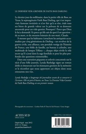 Le dernier jour du millénaire, dans la petite ville de Bass, au Texas, la septuagénaire Faith Bass Darling, qui s'est improvisée fumeuse invétérée et n'en fait qu'à sa tête, étale tous ses biens de grande valeur sur la pelouse de sa demeure ancestrale pour un vide-grenier. Pourquoi ? Parce que Dieu le lui a demandé. Et parce qu'elle sait de quoi il est question : de sa mort, et du meurtre lointain de son mari, Claude. À mesure que les habitants s'arrachent les antiquités accumulées par cinq générations de Darling - un revolver de la guerre civile, une alliance, une pendule vestige de l'histoire de France, une bible de famille, un bureau à cylindre, une multitude de lampes Tiffany -, chaque objet révèle le rôle secret qu'il a joué dans la saga familiale et pose les plus profondes des questions existentielles. Dans une narration piquante et enlevée concentrée sur le récit d'une folle journée, Lynda Rutledge signe un roman drôle et émouvant sur les étonnants greniers de la mémoire et le réconfort que nous apportent ces objets dont nous entourons nos vies.
