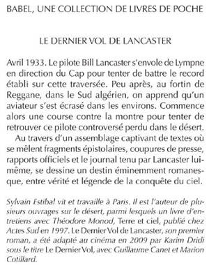Avril 1933. Le pilote Bill Lancaster s'envole de Lympne en direction du Cap pour tenter de battre le record établi sur cette traversée. Peu après, au fortin de Reggane, dans le Sud algérien, on apprend qu'un aviateur s'est écrasé dans les environs. Commence alors une course contre la montre pour tenter de retrouver ce pilote controversé perdu dans le désert. Au travers d'un assemblage captivant de textes où se mêlent fragments épistolaires, coupures de presse, rapports officiels et le journal tenu par Lancaster lui-même, se dessine un destin éminemment romanesque, entre vérité et légende de la conquête du ciel.