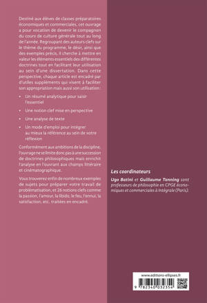Vous trouverez enfin de nombreux exemples de sujets pour préparer votre travail de problématisation, et 26 notions clefs comme la passion, l’amour, la libido, le feu, l’ennui, la satisfaction, etc. traitées en encadré.