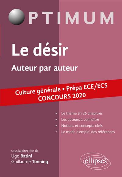 Destiné aux élèves de classes préparatoires économiques et commerciales, cet ouvrage a pour vocation de devenir le compagnon du cours de culture générale tout au long de l’année. Regroupant des auteurs clefs sur le thème du programme, le désir, ainsi que des exemples précis, il cherche à mettre en valeur les éléments essentiels des différentes doctrines tout en facilitant leur utilisation au sein d’une dissertation.