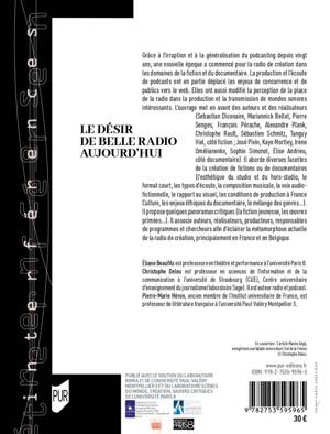 Grâce à l’irruption et à la généralisation du podcasting depuis vingt ans, une nouvelle époque a commencé pour la radio de création dans les domaines de la fiction et du documentaire. La production et l’écoute de podcasts ont en partie déplacé les enjeux de concurrence et de publics vers le web. Elles ont aussi modifié la perception de la place de la radio dans la production et la transmission de mondes sonores intéressants. L’ouvrage met en avant des auteurs et des réalisateurs (Sebastian Dicenaire, Mariannick Bellot, Pierre Senges, François Pérache, Alexandre Plank, Christophe Rault, Sébastien Schmitz, Tanguy Viel, côté fiction ; José Pivin, Kaye Mortley, Irène Omélianenko, Sophie Simonot, Élise Andrieu, côté documentaire). Il aborde diverses facettes de la création de fictions ou de documentaires (l’esthétique du studio et du hors-studio, le format court, les types d’écoute, la composition musicale, la voix audiofictionnelle, le rapport au visuel, les conditions de production à France Culture, les enjeux éthiques du documentaire, le mélange des genres…). Il propose quelques panoramas critiques (la fiction jeunesse, les oeuvres primées…). Il associe auteurs, réalisateurs, producteurs, responsables de programmes et chercheurs afin d’éclairer la métamorphose actuelle de la radio de création, principalement en France et en Belgique.