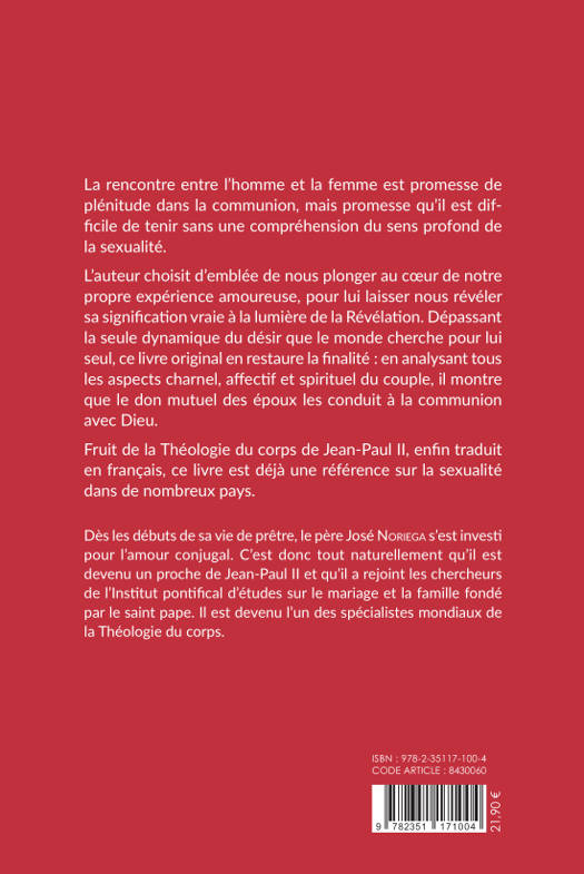 Ce livre original et profond s’interroge sur le sens de la sexualité humaine. Pour ce faire, l’auteur va au cœur de l’expérience de l’amour, en essayant d’en découvrir le sens et la finalité et de dépasser une vision romantique du couple. Le père Norieaga nous conduit à une compréhension complète de cette dimension essentielle de l’humanité par ses aspects charnel, affectif et spirituel. Le livre est structuré en quatre parties. La première, « La vocation à l’amour : sexualité et bonheur », explore le destin auquel conduit l’expérience de l’amour. La seconde, « Apprendre à aimer : passion et choix », explore la richesse de l’amour, non seulement comme un événement qui transforme, mais aussi comme une co-action qui construit la communion dans la concorde réciproque. La troisième, « Un amour excellent : chasteté et charité », approfondit la dynamique complexe du désir et sa valeur dans la vie concrète des personnes.