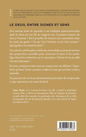 La thématique du deuil est abordée du côté d'une maman qui a perdu son fils. Qu'est-ce que la société fait des endeuillés ? Que représente la mort aujourd'hui ? Les pratiques funéraires ont-elles un sens ? Comprendre le travail du deuil représente-t-il une aide pour avancer ? Que disent les recherches sur la conscience ? Existe-t-il un au-delà à la mort physique ? Et vous, comment restez-vous en contact avec vos défunts ? Question que pose Anne Denis à celles et ceux qui témoignent ici.