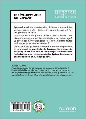 Cet ouvrage traite d'un aspect fondamental du développement de l'enfant : le langage. Après une présentation de l'évolution des théories concernant l'apprentissage du langage, il décrit les différentes phases d'acquisition et de développement, ainsi que les dysfonctionnements, en analysant les mécanismes mis en oeuvre.